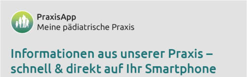 Holen Sie sich die PraxisApp Meine pädiatrische Praxis im App Store (iPhone) oder bei Google Play (Android)und melden Sie Ihr/e Kind/er bei einem unserer Ärzte an.Sie haben eine kurze Frage an uns oder wollen uns Befundfotos schicken? Sie möchten Rezepte oder Überweisungen bestellen? Dafür nutzen Sie bitte die Chat-Funktion der PraxisApp - eMails sindaus Sicherheitsgründen nicht geeignet.Termine können weiterhin online oder telefonisch vereinbart werden.Sie erhalten Hinweise auf anstehende Impfungen und Vorsorgen, Erinnerungen an Ihre Termine sowie aktuelle Informationen unserer Praxis direkt auf Ihr Smartphone!Über die PraxisApp sind unkompliziert Videosprechstunden möglich.Aktivieren Sie Push-Meldungen für die PraxisApp. Die PraxisApp ist werbefrei und für Sie kostenlos. Sie hat keinen Zugriff auf sensible Daten Ihres Smartphones.