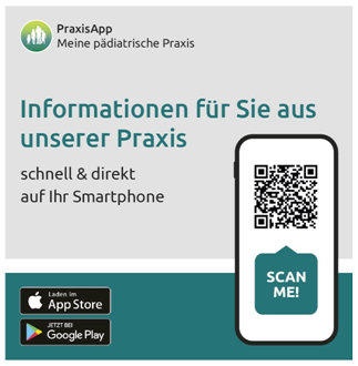 Holen Sie sich die PraxisApp „Meine pädiatrische Praxis“ im App Store (iPhone) oder bei Google Play (Android) und melden Sie Ihr/e Kind/er bei einem unserer Ärzte an.Sie erhalten Hinweise auf anstehende Impfungen und Vorsorgen, Erinnerungen an Ihre Termine sowie aktuelle Informationen unserer Praxis direkt auf Ihr Smartphone!Aktivieren Sie Push-Meldungen für die PraxisApp. Die PraxisApp ist werbefrei und für Sie kostenlos. Sie hat keinen Zugriff auf sensible Daten Ihres Smartphones.